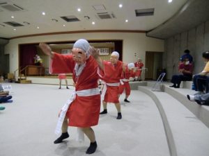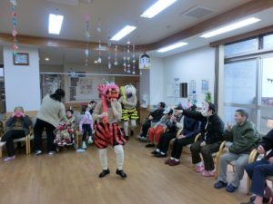 吹上学園では2月3日に節分の豆まきを行いました。 鬼に因んだ紙芝居や季節の歌を歌ったりと楽しんで頂きました。 そしてメインの豆まきを始めました。 鬼に扮したスタッフに、普段の日中活動で作った オカメやヒョットコのお面をかぶって 「鬼は外~、福は内~」と楽しんでいました。