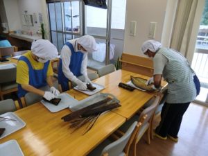 栄養士や支援員と一緒にもち米を竹の皮に入れて巻いて
