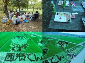 大きく育った杉やヒノキの雄大さ、田んぼに施された綺麗な絵を見学できて、