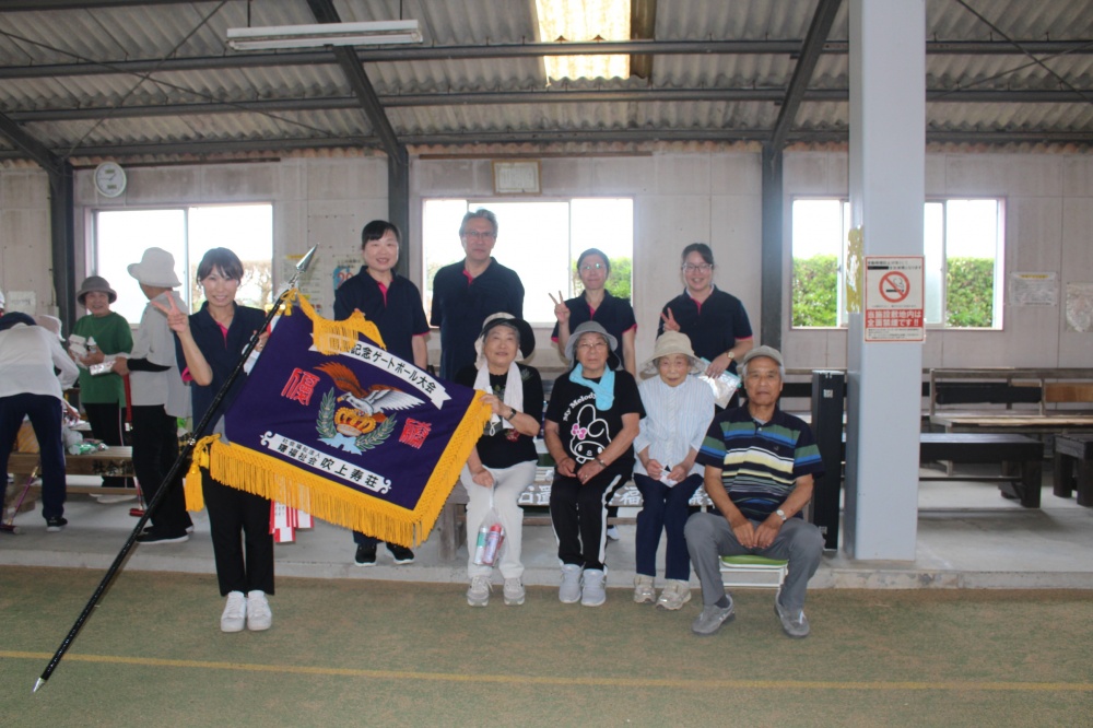 R7.7/5 第40回開園記念ゲートボール大会が日吉町冨ケ原組福祉プラザ横ドームにて11チームで行われました。職員、利用者さんでチームを組み交代でゲームに参加しました。ボールが狙う場所へ行かず大笑いでした。猛暑の中でしたが、暑さに負けずにゲームを楽しみました。結果は何と!!初めての優勝でした。優勝旗を手に笑顔での記念写真になりました。1日、お疲れ様でした。また来年も頑張りましょう‼